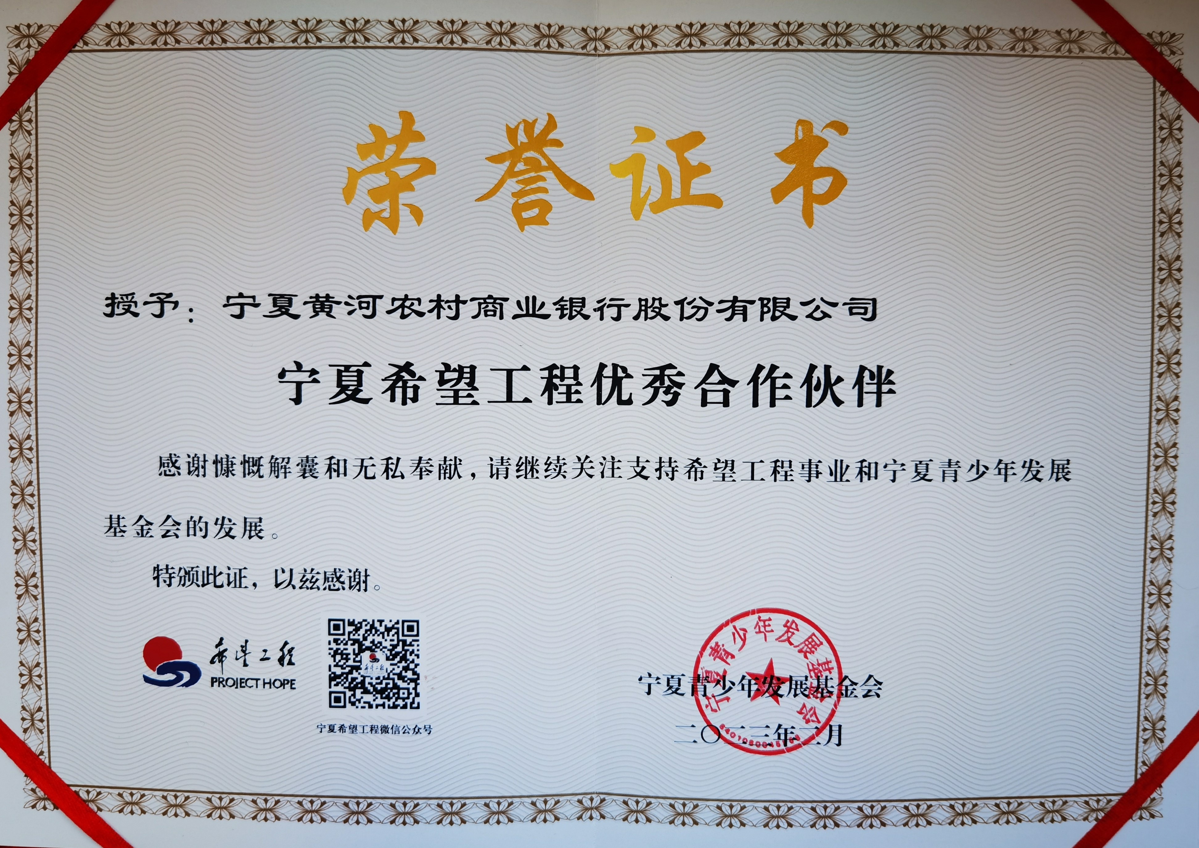 近日,自治区团委、宁夏青少年发展基金会召开会议,表彰一批长期以来为希望工程作出突出贡献的单位,黄河银行荣获“宁夏希望工程优秀合作伙伴”称号。