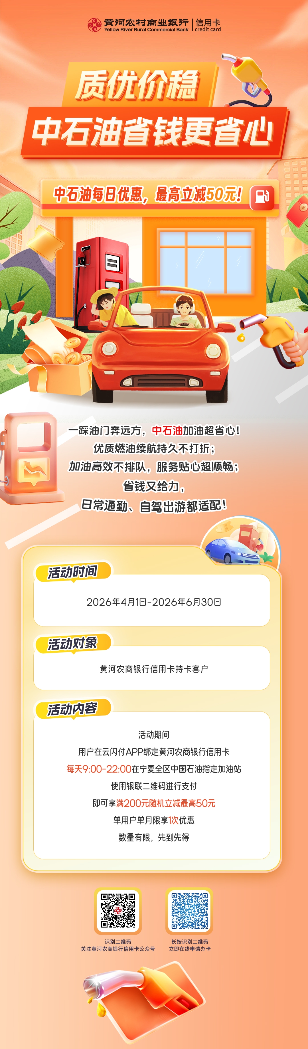 【车主必看】养车太贵?刷黄河农商银行信用卡帮您省!中石油每日优惠,最高立减50元